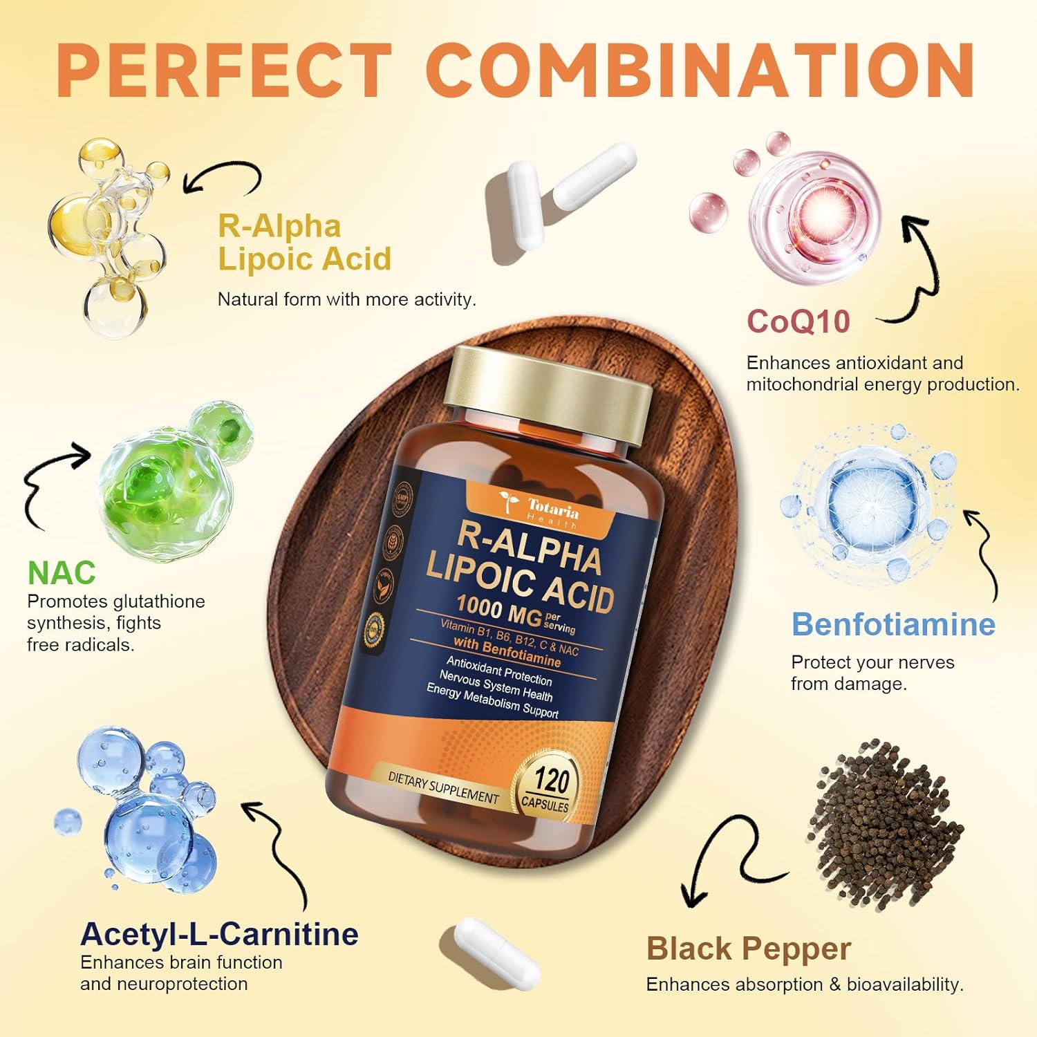 - Natural Active Form for Better Absorption: Our formula features R-Alpha Lipoic Acid (R-ALA)—the natural, bioactive form found in the human body. Compared to the synthetic R/S-ALA mix, R-ALA offers greater bioavailability and stability, making it easier for the body to absorb and utilize.