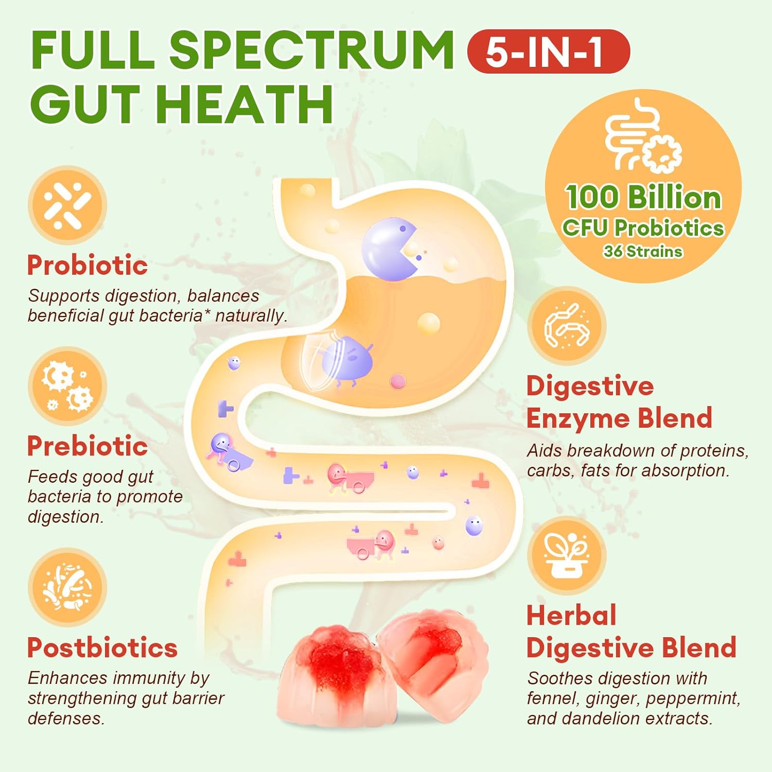 - Pre Post Probiotics Gummies 5-in-1: Totaria's Pre + Post + Probiotics Gummies combine the power of prebiotics (including inulin and fiber), probiotics, postbiotics, digestive enzymes, and potent herbs into one complete gut support solution. Every ingredient is carefully selected for its proven benefits in supporting digestive health and immune function.