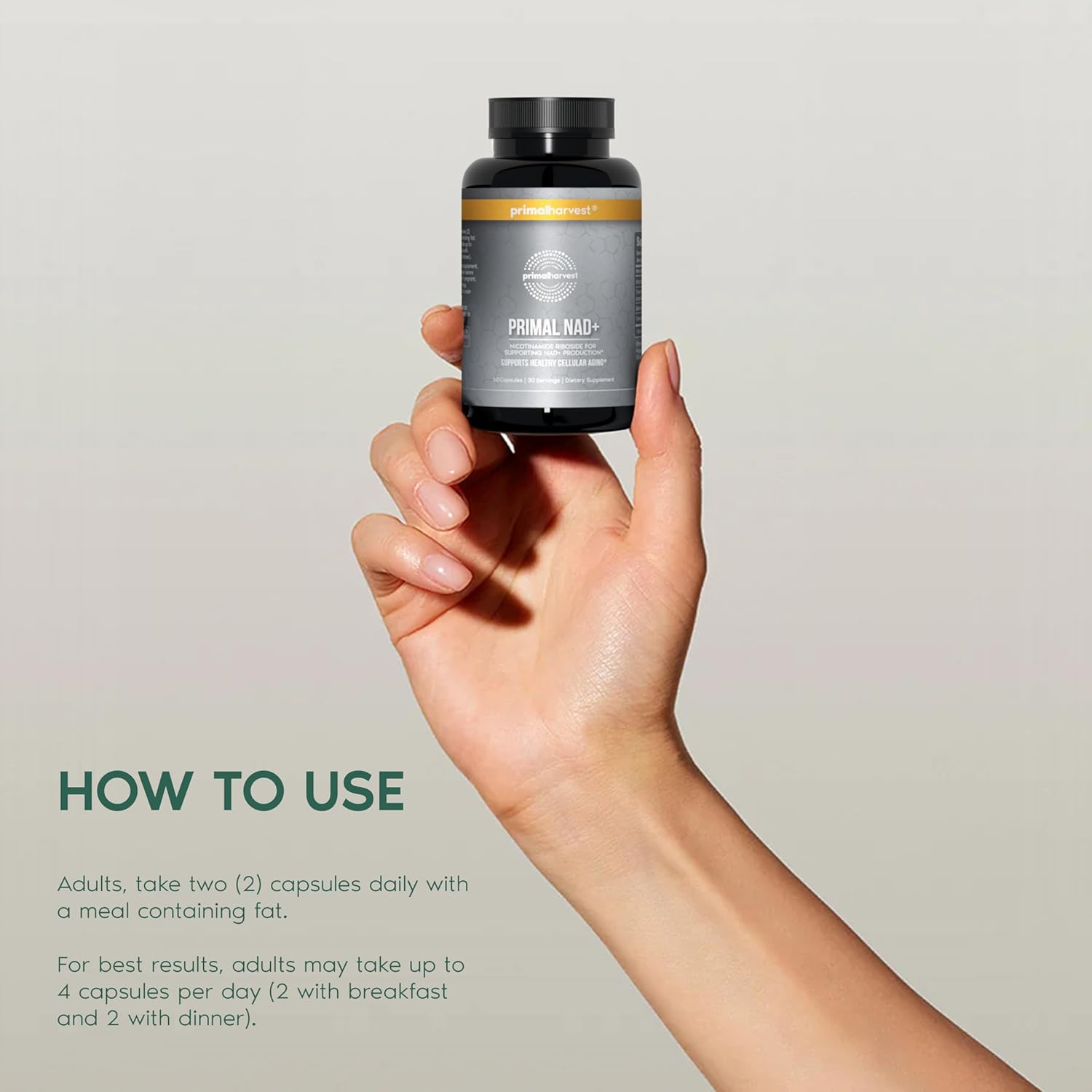 - The Primal Harvest Promise: Beyond Wellness A 360 approach to wellness, Made in the USA with globally sourced ingredients, PRIMAL NAD+ is gluten-free, dairy-free, soy-free, and packaged in vegetarian capsules.