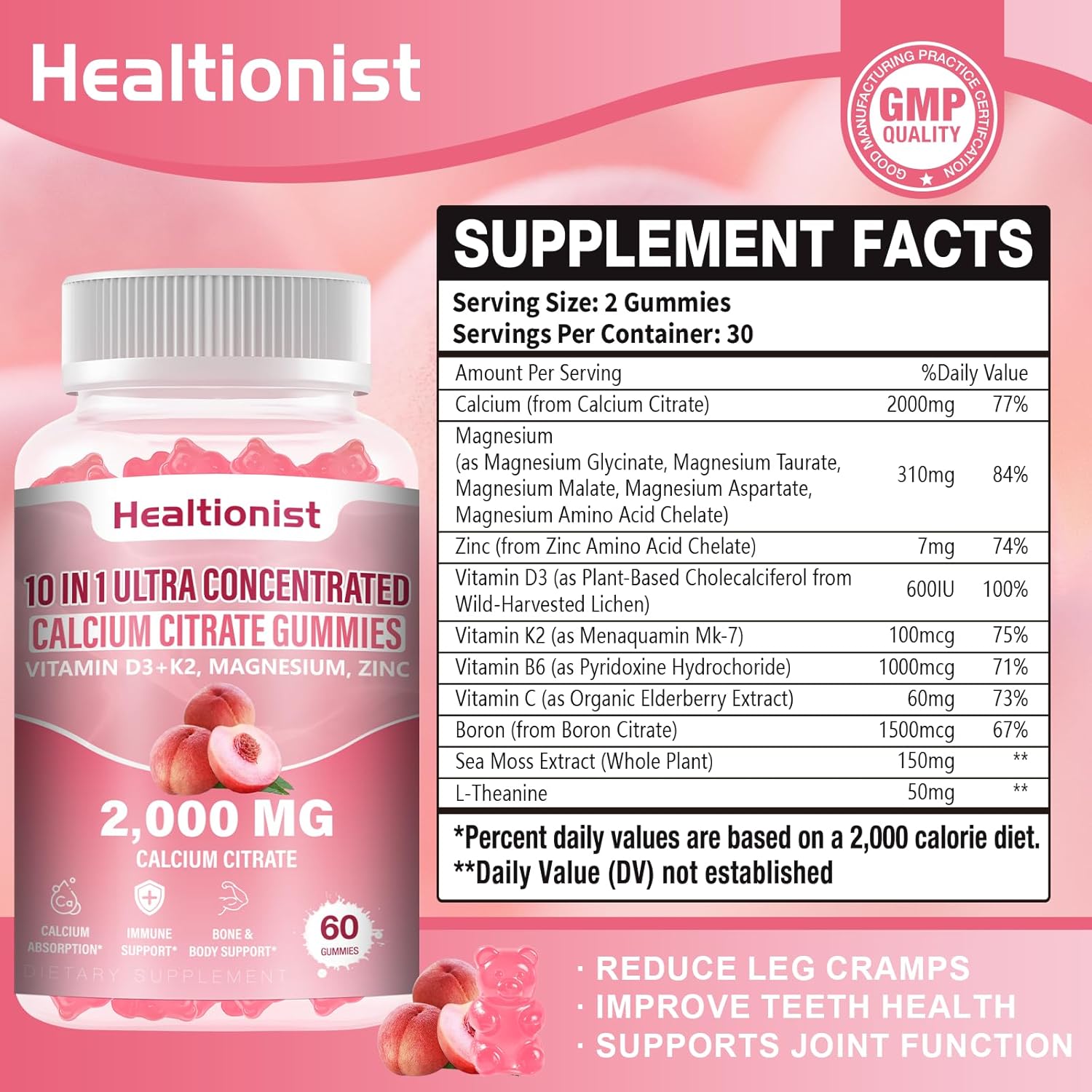 - Extra Strength 10-IN-1 Calcium Citrate Gummies: Healtionist 2000mg calcium citrate gummies supplements is different from other traditional calcium carbonate supplements. Calcium citrate is more easily absorbed by the human body and does not require an acidic environment to be absorbed. Therefore, the time of taking it is also relatively flexible, making it very suitable for people who take it on an empty stomach or with low stomach acid.