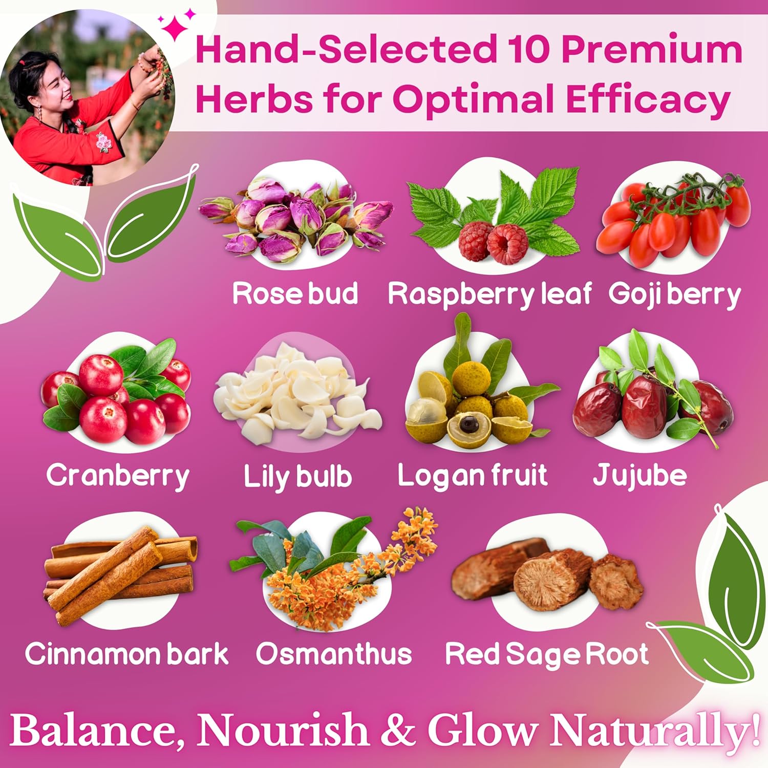 - 🍃 CAFFEINE-FREE & ANTIOXIDANT-RICH – Enjoy this Chinese period tea hot or iced, with delicate floral notes from rose tea and raspberry leaf tea, blended with cinnamon tea and goji berry tea for a naturally smooth, refreshing taste.