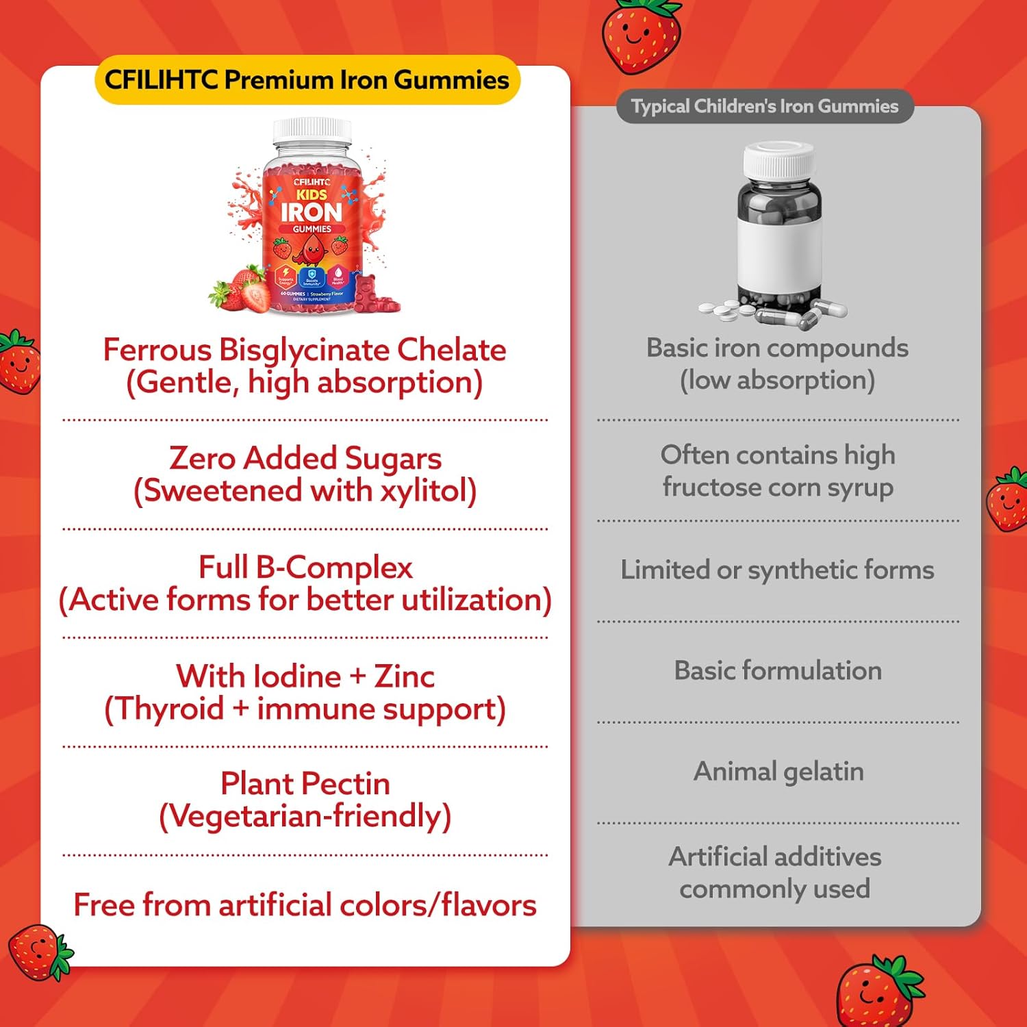 - BOOST IRON LEVELS EFFORTLESSLY: Our delicious strawberry gummies make supporting healthy iron levels fun and easy for kids. This gentle formula helps combat iron deficiency, supporting your child's natural energy and growth without the struggle
