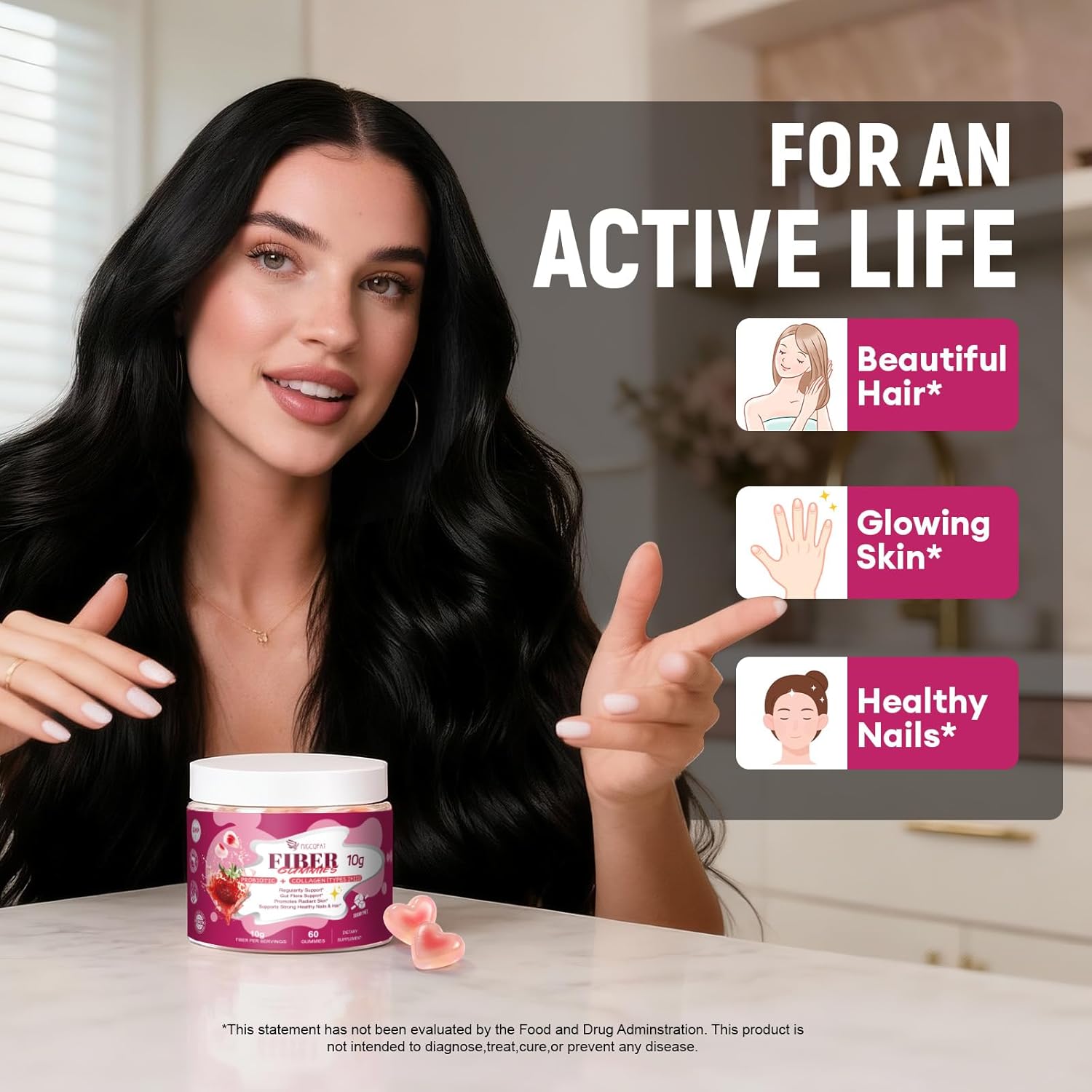10G Fiber Gummies with Collagen Peptides, Hyaluronic Acid, Vitamin C, ACV, 30 Billion CFU Probiotics – Sugar Free Collagen Gummy for Skin, Hair & Nails – Digestive Health Support – 60 Cts